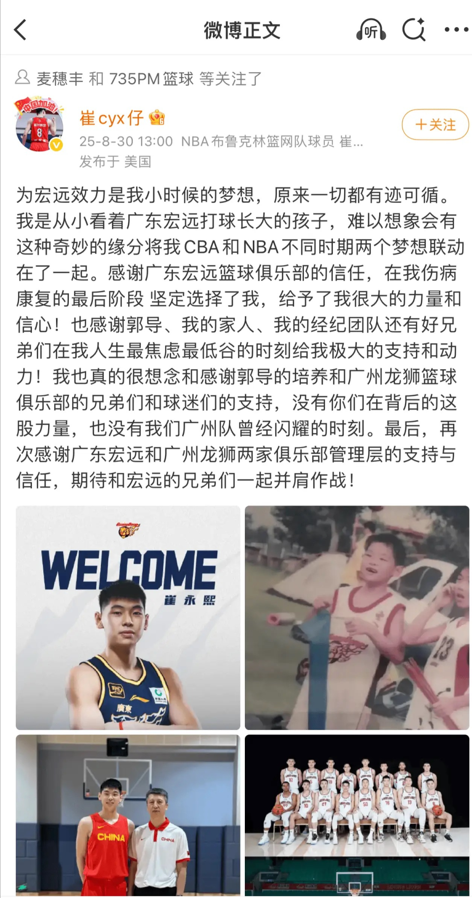 官宣加盟广东!崔永熙:为宏远效力是儿时梦想,从小就看广东打球